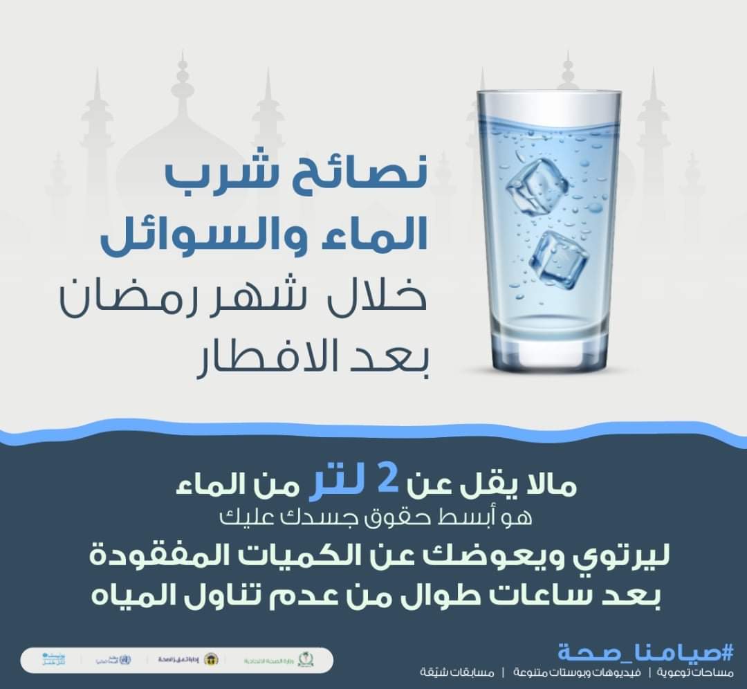 🔵مالا يقل عن 2 لتر من الماء هو ابسط حقوق جسدك عليك ليرتوي ويعوضك عن الكميات المفقودة بعد ساعات طوال من العمل في نهار رمضان.
