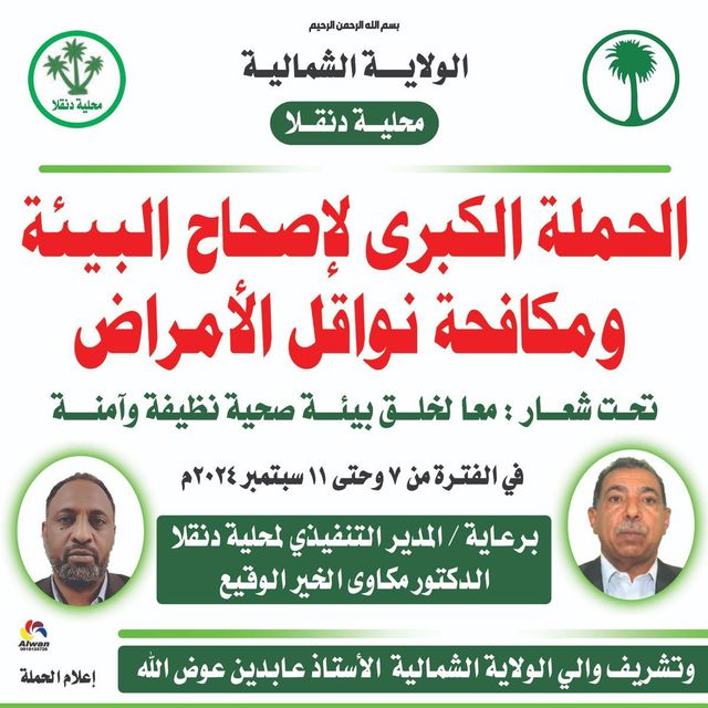 دشّن والي الولاية الشمالية، أ/عابدين عوض الله، اليوم حملة كبرى لإصحاح البيئة ومكافحة نواقل الأمراض بمحلية دنقلا، برعاية المدير التنفيذي للمحلية، د/مكاوي الخير، وبالشراكة مع وزارة الصحة بالولاية والمقاومة الشعبية وعدد من المؤسسات.