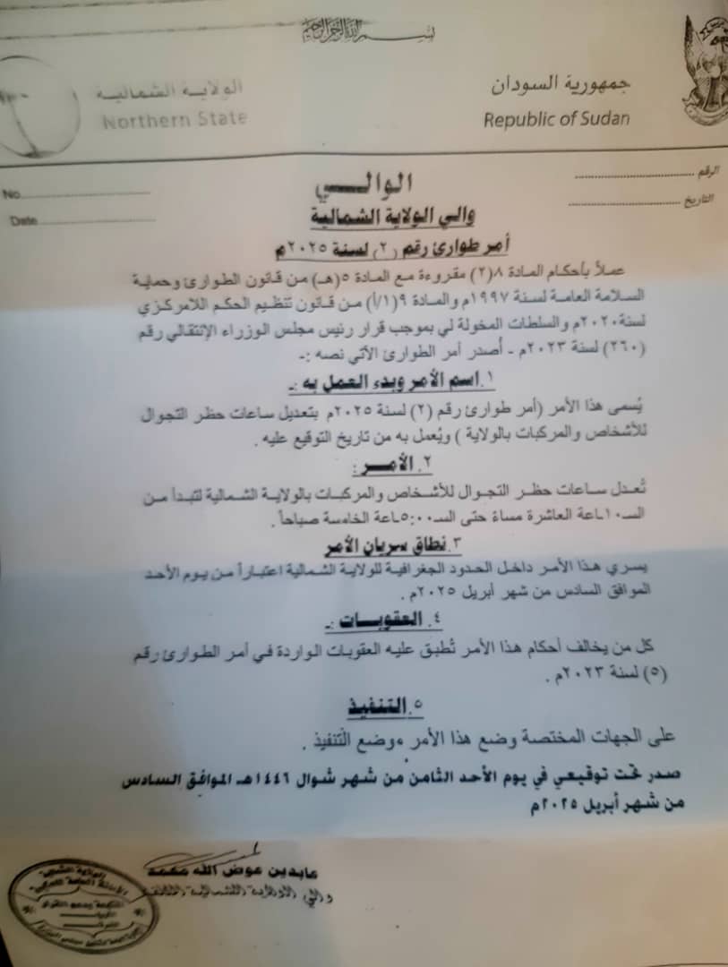 أصدر والي الشمالية الأستاذ عابدين عوض الله، أمر طوارئ رقم ٢ لسنة ٢٠٢٥م بتعديل ساعات حظر التجوال للأشخاص والمركبات بالولاية،