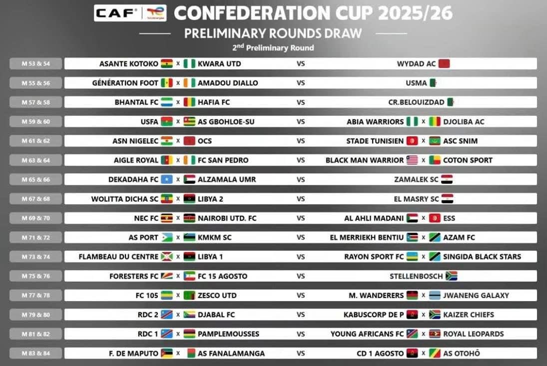 أما في بطولة الكونفدرالية، فقد أوقعت القرعة فريق الزمالة أم روابة في مواجهة ديكاداها الصومالي، بينما يواجه الأهلي مدني فريق النجم الساحلي التونسي.