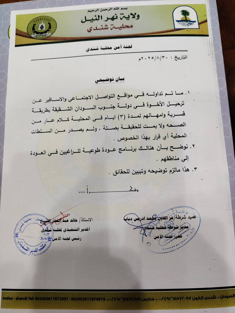 أصدرت لجنة الأمن بمحلية شندي بيان توضيحي فندت من خلاله ما تم تداوله في مواقع التواصل الاجتماعي والاسافير عن ترحيل الاخوة في دولة جنوب السودان الشقيقة بطريقة قسرية وامهالهم لمدة ثلاثه ايام في المحلية حديث عار من الصحة ولا يمت للحقيقة بصلة ولم يصدر من السلطات المحلية اي قرار بهذا الخصوص. وتوضح اللجنة الأمنية بأن هنالك عودة طوعية للراغبين في العوده الى مناطقهم و هذا ما لزم توضيحه وتبيين للحقائق وتم توقيعه بقلم الاستاذ خالد عبد الغفار الشيخ المدير التنفيذي رئيس لجنة الأمن وسعادة العميد شرطة عز الدين محمد ادريس دياب مدير شرطة محلية شندي مقرر اللجنة الأمنية