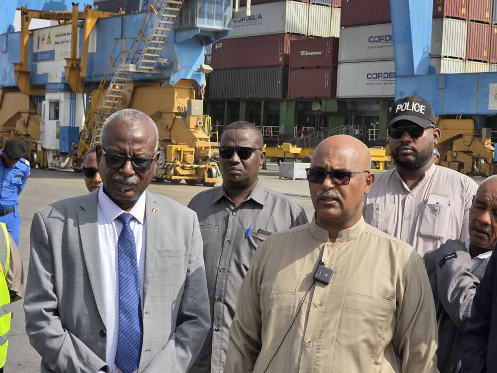 تفقد الاستاذ سيف النصر التجاني وزير البنية التحتية والنقل يرافقه المهندس مستشار جيلاني محمد جيلاني مدير عام هيئة المواني البحرية ، تفقد ميناء بورتسودان الجنوبي ، وتلقى سيادته شرحا عن سير العمل بالميناء