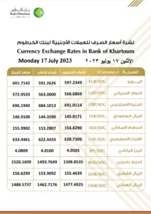 اسعار العملات العربية و العالمية مقابل الجنيه السوداني اليوم الإثنين الموافق ١٧ يوليو ٢٠٢٣م